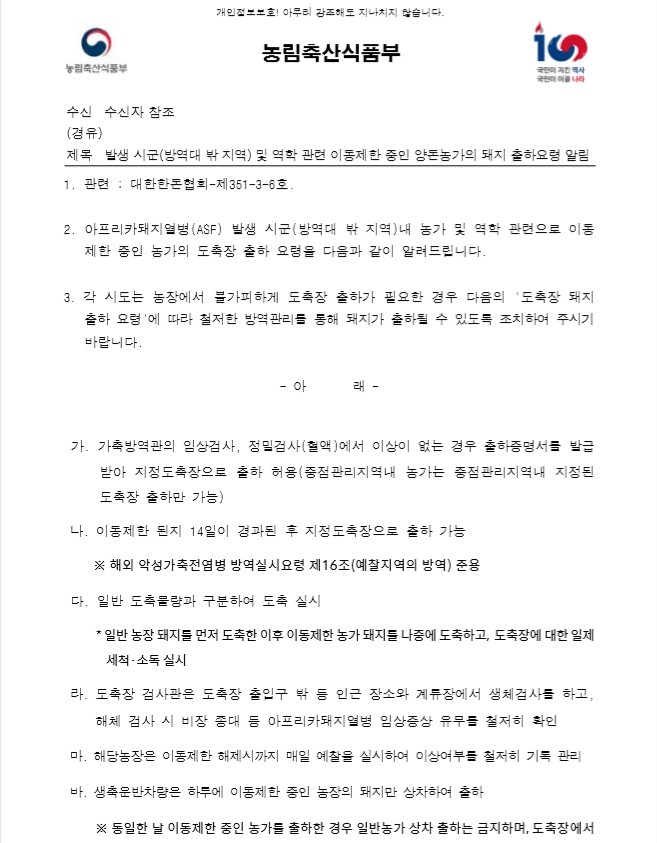| 1001 농림부 발생시군 이동제한중 돼지 출하요령 알림 (0) | 2019.10.02 |